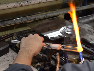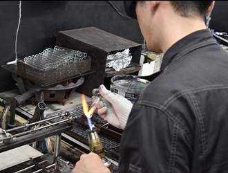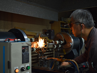 自社製のバーナーを作製するなど、金属加工を始めとして、ガラスとほかの素材(樹脂、金属等)を組み合わせた加工も行っています。